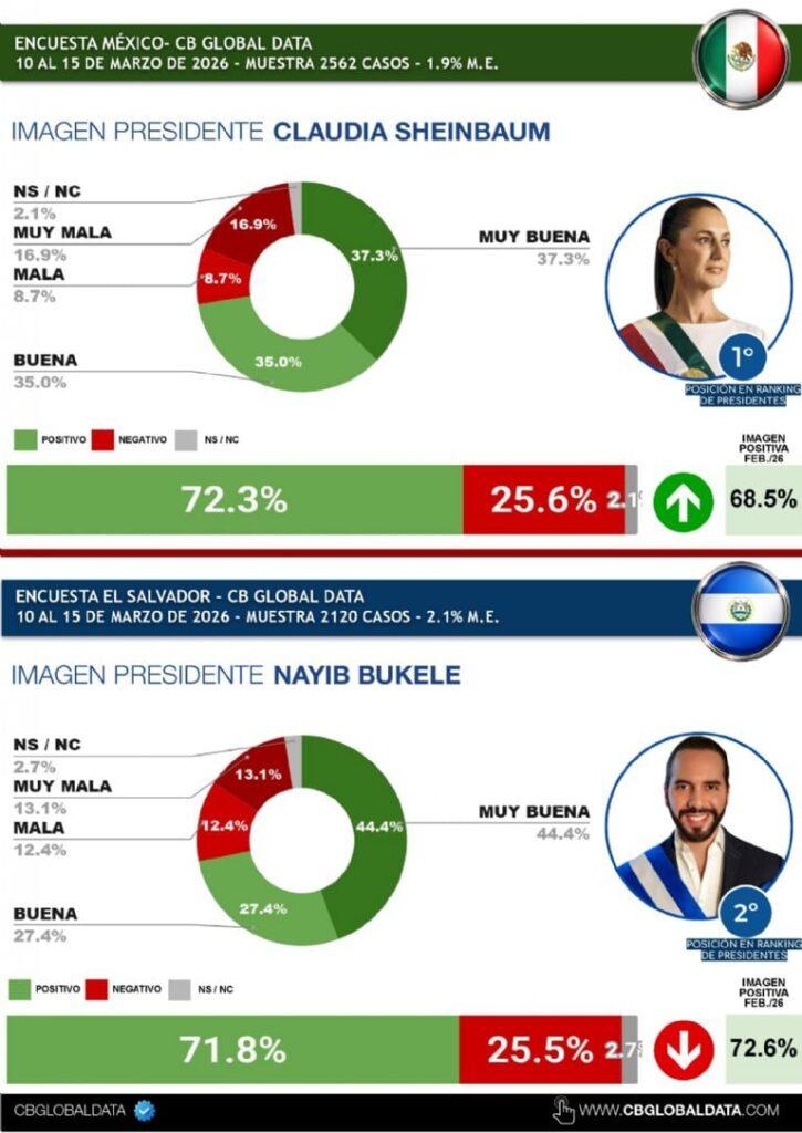 La presidenta de México, Claudia Sheinbaum Pardo, encabezó el ranking de mandatarios de América Latina correspondiente a marzo de 2026 elaborado por CB Global Data, al registrar una imagen positiva de 72.3 por ciento entre los ciudadanos mexicanos.