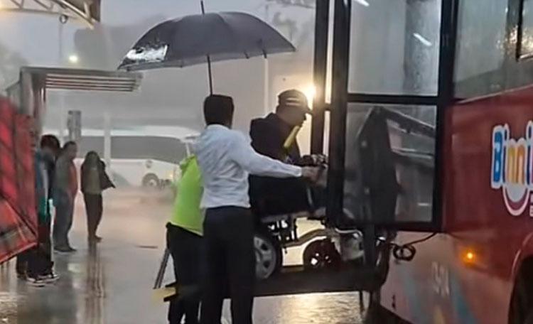 Conductor de Binnibus protege de la lluvia a persona con discapacidad que esperaba subir a la unidad; le aplauden en redes