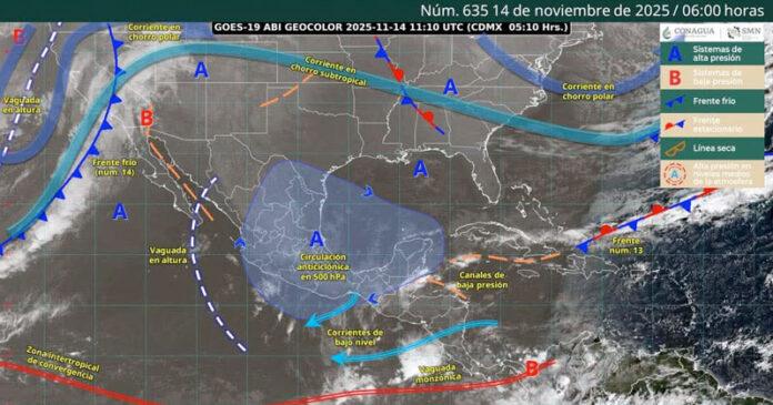 Debido a la poca nubosidad se tendrá alta radiación solar en horas centrales del día, mientras que el viento del norte moderado permanecerá en el oriente del Istmo y Golfo de Tehuantepec.