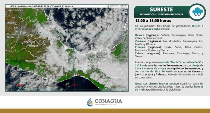 Oaxaca de Juárez, Oax. 11 de noviembre de 2025.- Ante el paso del frente frío número 13, la Coordinación Estatal de Protección Civil y Gestión de Riesgos (CEPCyGR) dio a conocer que persiste el evento de norte en la región del Istmo de Tehuantepec, principalmente en el tramo carretero La Venta–La Ventosa, donde se registran rachas de viento de hasta 110 kilómetros por hora.
