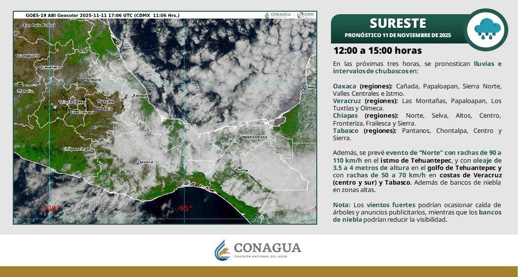 Toda vez que la masa de aire frío que impulsa al frente continuará generando vientos fuertes, descenso de temperatura y oleaje elevado en aguas del Golfo de Tehuantepec; se recomienda a la población evitar transitar por la zona durante ráfagas intensas, así como asegurar láminas, techumbres ligeras y objetos que puedan ser desprendidos por el viento.