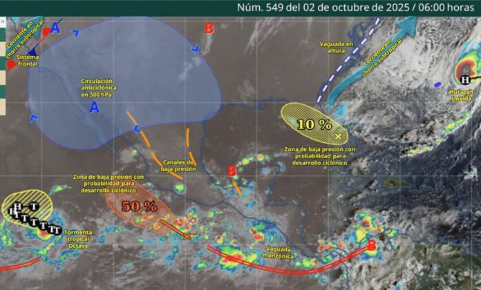 Algunas de estas precipitaciones serán localmente fuertes y apoyadas por el calentamiento diurno en el Istmo de Tehuantepec, Costa, Sierra Sur y Mixteca, donde además habrá actividad eléctrica, viento de 20 a 35 kilómetros por hora con rachas mayores al paso de la tormenta.