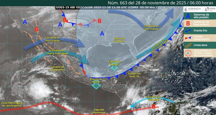 Estas condiciones derivan del frente frío número 16, el cual se extiende desde el sur de Florida hacia el mar Caribe, mientras que su porción posterior se ubica sobre el sur del Golfo de México, generando una vaguada por delante del sistema.