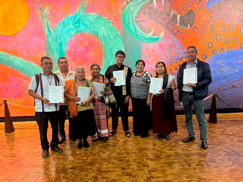 En la ceremonia de premiación, realizada en el Auditorio Torres Bodet del Museo Nacional de Antropología, sobresale el reconocimiento a las y los creadores: Lila Hernández Bautista, de Teotitlán del Valle, con la obra “Celestes en carmín”, ganadora del Tercer Galardón Nacional; Aldair Jafet Sánchez Sugia, de Pinotepa de Don Luis, con “Nda’a ita Ñuu Savi”, acreedor al Premio Especial a la mejor obra de rescate antigua.