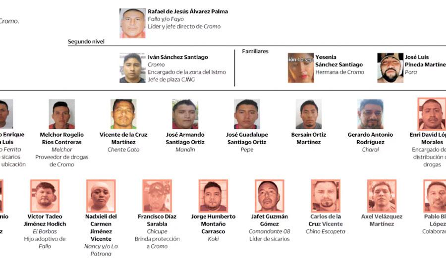Según el informe, entre los detenidos más importantes se encuentran Pedro Antonio Tonche Velázquez, Tonche, jefe de plaza de Los Cromo en Juchitán; Jorge Humberto Montaño Carrasco, Koki, sucesor de Tonche y segun- do al mando de Cromo; Francisco Díaz Sarabia, Chicupe, jefe de seguridad en Xadani de Cromo; Cristian Antonio Vázquez Vázquez, La Parka, jefe de sicarios de alias Cromo; Mariano Reyes Santiago, Veterinario, encargado de extorsiones en Juchitán; Jafet Guzmán Gómez, Comandante 08, jefe de plaza en Ixtepec, y Jorge López Guerra (a) Guerra, colaborador de Iván Sánchez Santiago, Cromo, quien coaccionaba a ganaderos locales.
