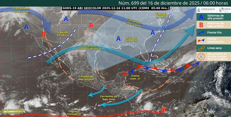 De acuerdo con el pronóstico del tiempo emitido por la Comisión Nacional del Agua (Conagua), estas condiciones se derivan de que el frente frío número 21 permanece casi estacionario sobre el Golfo de México, en interacción con un canal de baja presión establecido sobre el sureste de la República Mexicana.