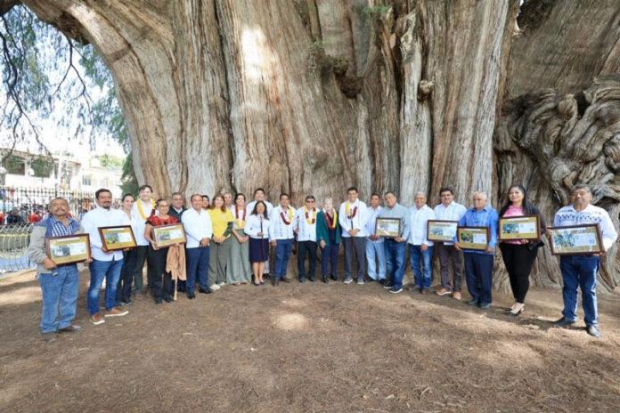 Santa María del Tule, Oax.– Frente al milenario Árbol del Tule, el Gobernador Salomón Jara Cruz y la secretaria de Medio Ambiente y Recursos Naturales (Semarnat) del Gobierno de México, Alicia Bárcena Ibarra, entregaron ocho certificados de Árboles Notables e Históricos a autoridades municipales.