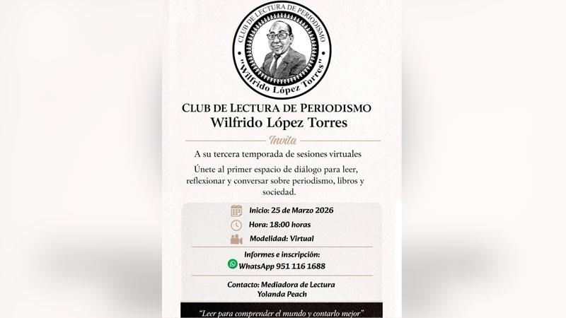 El Club de Lectura de Periodismo “Wilfrido López Torres”, un espacio dedicado a la lectura, el análisis y la conversación sobre periodismo, periodistas, libros y sociedad, iniciará su tercera temporada de sesiones virtuales, el próximo miércoles 25 de marzo, a las 18:00 horas.