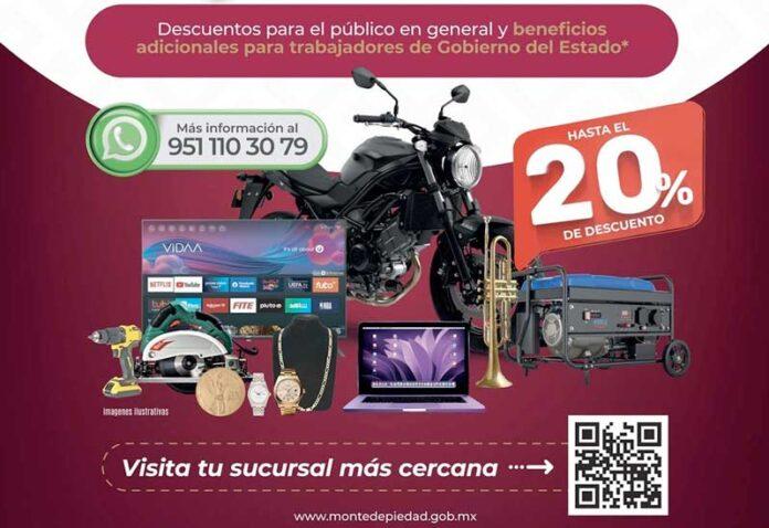 Durante este periodo, el público en general podrá aprovechar descuentos de hasta el 20 por ciento en el área de almoneda, artículos varios, vehículos; así como en joyería de oro y plata.
