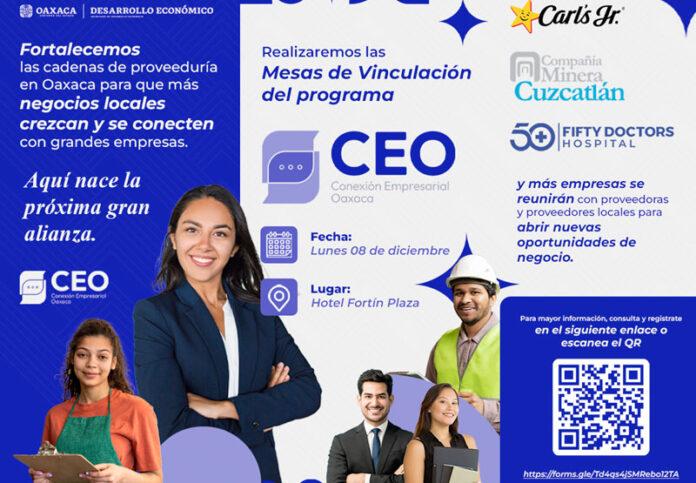 Oaxaca de Juárez, Oax.- La Secretaría de Desarrollo Económico (Sedeco) invita a las Micro, pequeñas y medianas empresas (Mipymes), así como personas emprendedoras, a participar en las Mesas de Vinculación del programa Conexión Empresarial Oaxaca (CEO), que se realizarán el próximo 8 de diciembre a las 8:30 horas en el Hotel Fortín Plaza.