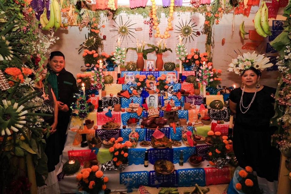 “El papel picado da movimiento, los cempasúchil y las crestas de gallo llenan de color el altar, mientras los aromas del pan, las frutas, el mezcal y el estofado se combinan; los elementos están cuidadosamente colocados para honrar a quienes ya no están”, señaló enfático, al describir la composición del altar y su significado dentro de la tradición de su pueblo.