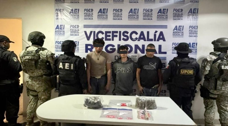 Oaxaca de Juárez, Oax.- La Fiscalía General del Estado de Oaxaca (FGEO) obtuvo auto de Vinculación a Proceso contra tres personas del sexo masculino identificados como C.R.A., B.S.R.G y G.A.P.S., imputados por el delito contra la salud en su modalidad de narcomenudeo en su hipótesis de comercio y posesión que operaban en el distrito de Zimatlán de Álvarez en los Valles Centrales.