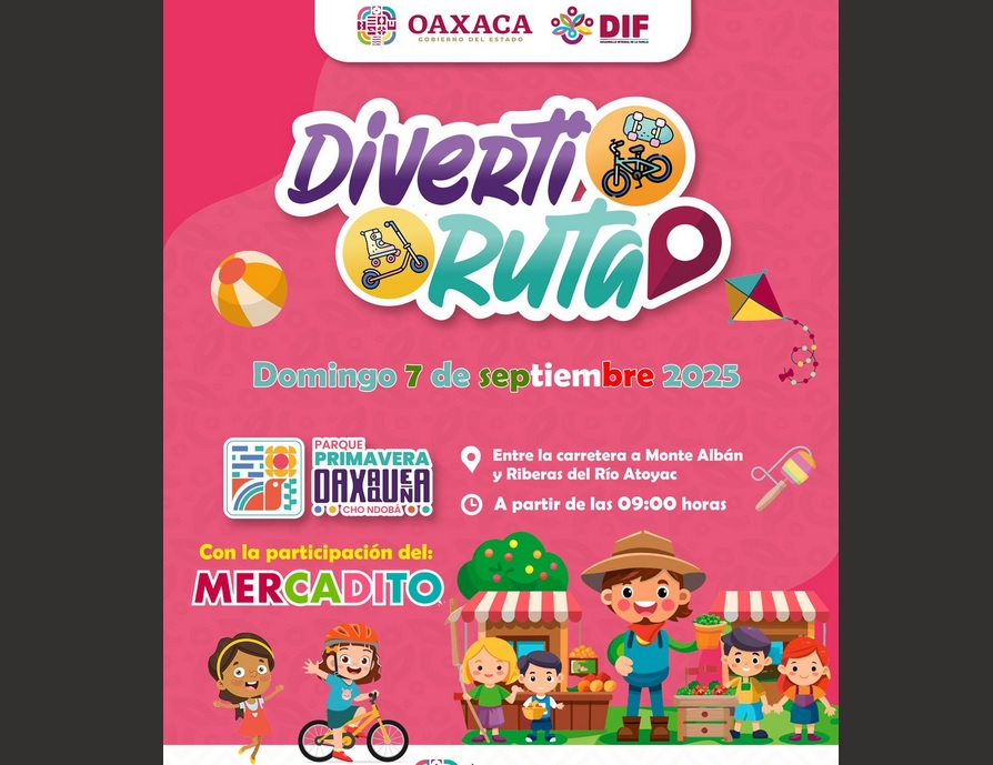 Oaxaca de Juárez, Oax.- El Sistema para el Desarrollo Integral de la Familia (DIF) Oaxaca invita a la niñez, adolescencias y sus familias a la 42ª Diverti Ruta, a realizarse este domingo 7 de septiembre, de 9:00 a 13:00 horas, en el Parque Primavera Oaxaqueña Cho Ndobá.
