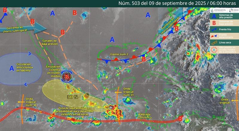 La dependencia indica que la onda tropical número 31 ha salido al Golfo de Tehuantepec y está asociada con una baja presión, por lo que se espera su acercamiento por la tarde-noche de este martes y miércoles sobre gran parte del estado.