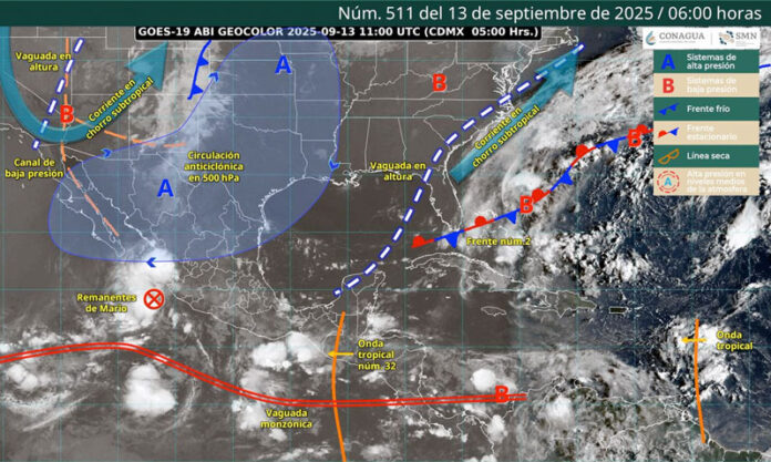 En tanto, la onda tropical número 32 se internará sobre la península de Yucatán durante la mañana y el eje delantero se internará en Chiapas y oriente de Oaxaca por la tarde, que aumentará la inestabilidad.