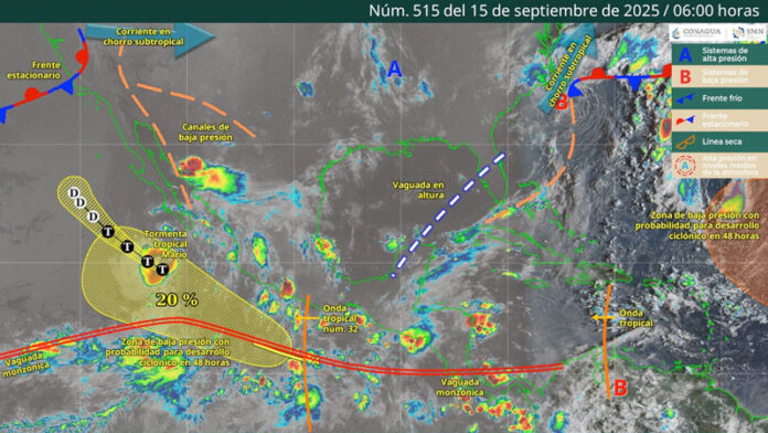 De acuerdo con el pronóstico del tiempo emitido por la Comisión Nacional del Agua (Conagua), estas condiciones son debido a la onda tropical número 32 combinada con una zona de baja presión y la cercanía a la línea de costa de la vaguada monzónica.