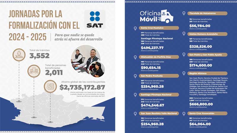 La estrategia acerca los servicios del SAT a las comunidades, para que los negocios se den de alta en el Registro Federal de Contribuyentes. Durante 2024 y en lo que va de este 2025, se han efectuado un total 3 mil 552 trámites.