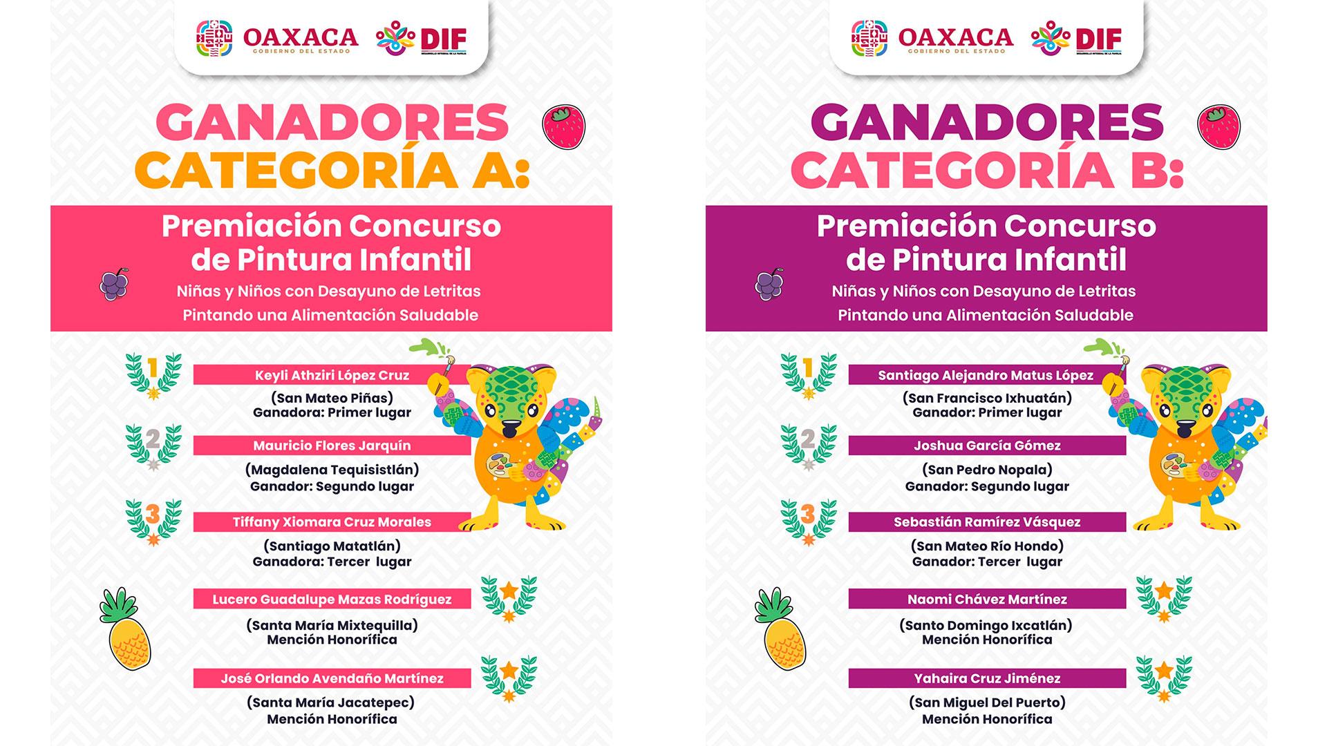 El certamen realizado a través de la Dirección de Operación de Asistencia Alimentaria informa que, en la categoría A, el primer lugar lo obtuvo Keyli Athziri López Cruz, originaria de San Mateo Piñas; el segundo Mauricio Flores Jarquín, de Magdalena Tequisistlán; y el tercero Tiffany Xiomara Cruz Morales, de Santiago Matatlán.