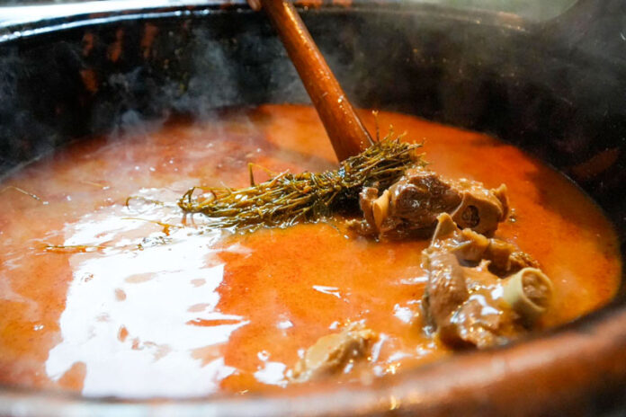 Esta comida se prepara con la cadera y el espinazo del chivo, junto con una salsa vibrante de chiles, tomate y hierbas de la región como la pepicha y el huaje, además de hojas de aguacate.