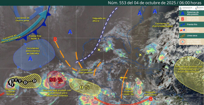 Esto se debe a la interacción de varios sistemas meteorológicos: la influencia indirecta de una zona de baja presión con alta probabilidad de desarrollo ciclónico al sur de las costas de Michoacán, Colima y Jalisco; la vaguada monzónica, y un canal de baja presión.