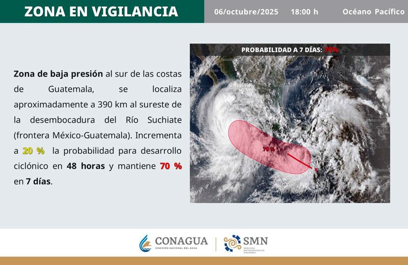 De acuerdo con el pronóstico de la Comisión Nacional del Agua (Conagua), este fenómeno meteorológico se prevé avance en el transcurso de esta semana en paralelo a las costas del Pacífico mexicano; con un 10 por ciento de probabilidad de desarrollo ciclónico en el transcurso de 2 días, y del 70 por ciento en 7 días.