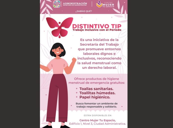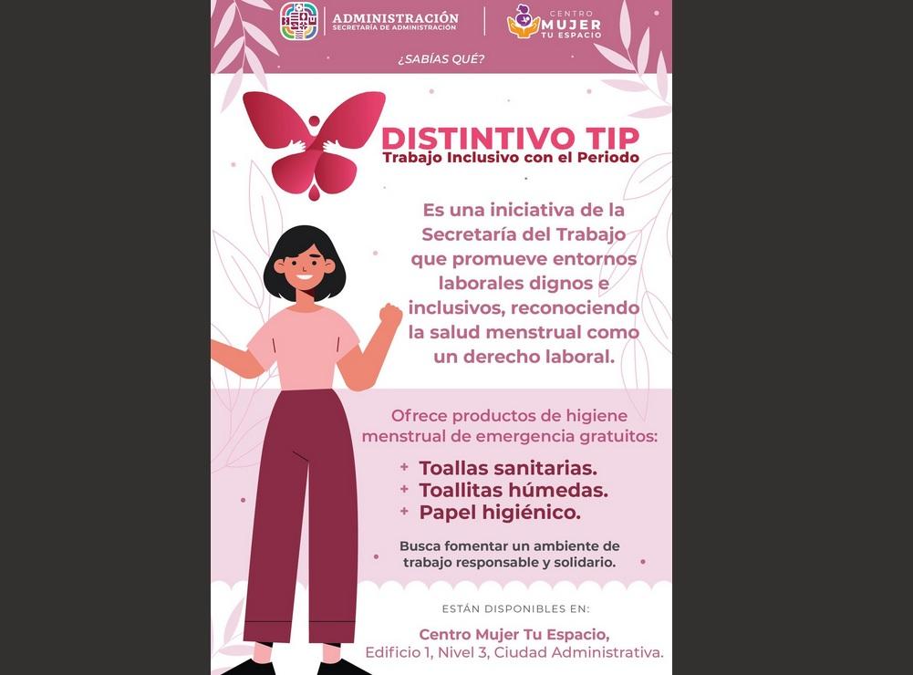A través del Centro Mujer Tu Espacio, ubicado en el Edificio 1, nivel 3 de Ciudad Administrativa Benemérito de las Américas; la SA pone a disposición, de manera gratuita, toallas sanitarias, toallitas húmedas y papel higiénico.