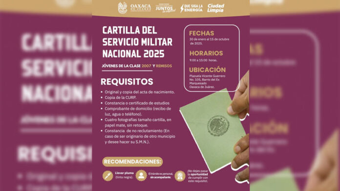 Oaxaca de Juárez, Oax.– El Gobierno Municipal de Oaxaca de Juárez informa a las y los jóvenes de la clase 2007 y remisos que el próximo 15 de octubre vence el plazo para realizar el trámite de la Cartilla del Servicio Militar Nacional 2025, por lo que se hace un llamado a acudir a tiempo y cumplir con este importante requisito cívico.