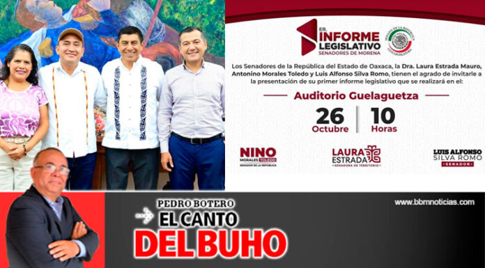 Por hoy es tocho. Recuerden, cuando el Búho canta el indio muere. Pd.- De contaminación y contrabando fiscal. Nos aseguran, fuentes confiables,  que el  nivel de contaminación del guachicolfiscal, podría llegar por los rumbos de García Vigil esquina con Colón. La lista de involucrados increchendo… con riesgos de infectar a palacio municipal.  Ya solo falta que aparezca el ex gobernador Gabino Cué. La bomba puede estallar en cualquier momento.