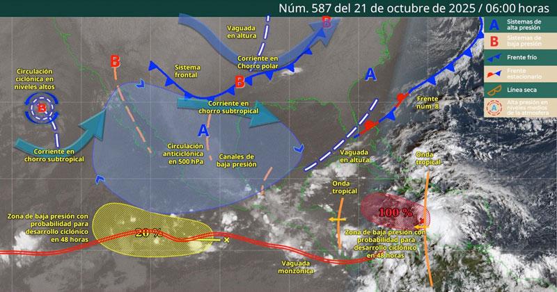 Lo anterior es ocasionado por una zona de baja presión con probabilidad de desarrollo ciclónico al sur de las costas de Oaxaca, en combinación con la vaguada monzónica, localizada próxima a la línea de costa; las cuales impulsarán aire húmedo y cálido.