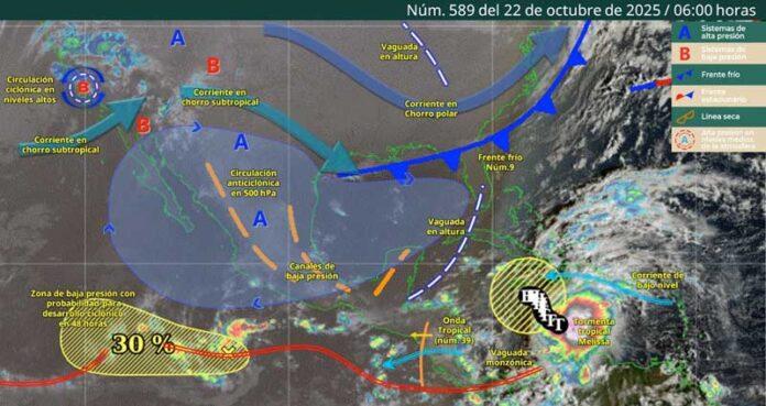 Estas precipitaciones son ocasionadas por la onda tropical número 39, la cual se desplazará sobre Chiapas y posteriormente se internará sobre el oriente de Oaxaca, en combinación con un canal de baja presión.