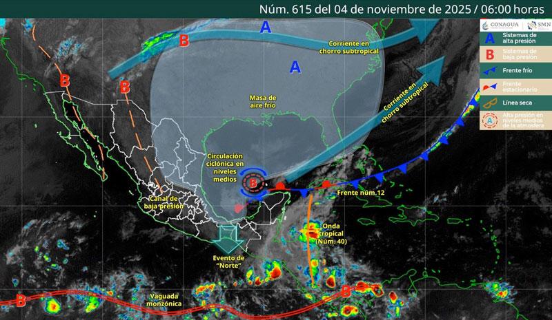 Además, hay riesgo de heladas en picos altos localizados por encima de los mil 800 metros sobre el nivel medio del mar; ocasionadas por la masa de aire frío del frente frío número 12.