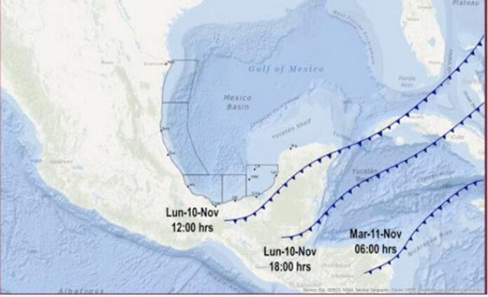 De acuerdo con la Comisión Nacional del Agua, la masa de aire frío de origen ártico que impulsa al sistema frontal, establecerá vientos del norte de 60 a 70 kilómetros por hora (km/h), con rachas de 90 a 110 km/h en el tramo carretero La Venta–La Ventosa.