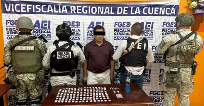 Oaxaca de Juárez.-Como parte de las acciones estratégicas para el combate a los delitos de alto impacto, la Fiscalía General del Estado de Oaxaca (FGEO), en coordinación interinstitucional, cumplimentó una orden de cateo ejecutada en un establecimiento comercial ubicado en la región de la Sierra Norte, logrando la detención de una persona y el aseguramiento de diversas dosis de droga.