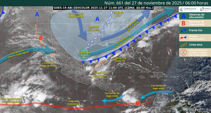 Estas condiciones derivan de la presencia del frente frío número 16, el cual se extiende sobre el Golfo de México hasta la Península de Yucatán, en interacción con un canal de baja presión en el oriente y sureste del país.