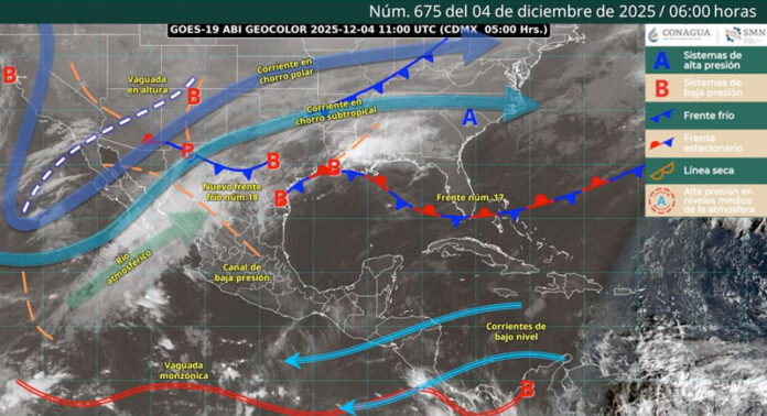 De acuerdo con el pronóstico del tiempo emitido por la Comisión Nacional del Agua (Conagua), estas condiciones son ocasionadas por el frente frío número 17 que permanece casi estacionario sobre el Golfo de México, comportándose como un frente ondulante con tendencia a mantenerse en esa zona hasta el fin de semana, aportando escurrimientos de aire fresco y frío hacia el estado.