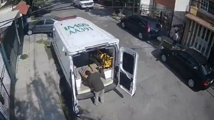 El hecho ocurrió el pasado 1 de diciembre a las 11:35 horas, en la colonia Parques, a bordo de la unidad AA391, de la que descendieron un hombre y dos mujeres. De acuerdo con el ideo captado por una cámara de seguridad, el conductor de la ambulancia, las mujeres y otras personas bajaron arena, loseta y material de construcción del vehículo del IMSS.