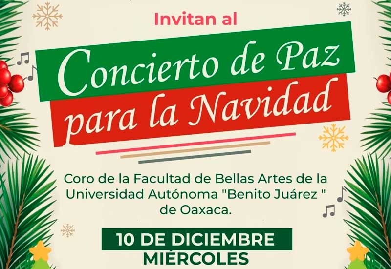 Oaxaca de Juárez, Oax.- El Gobierno del Estado invita a la población y visitantes al Concierto de Paz para la Navidad, que se llevará a cabo este miércoles 10 diciembre a las 18:00 horas en el Zócalo de la ciudad de Oaxaca.