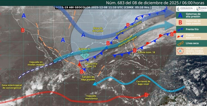 Estas condiciones se deben al frente frío número 19, ubicado sobre el Golfo de México, el cual continuará su desplazamiento hacia el sureste, alcanzando la Península de Yucatán durante la noche.