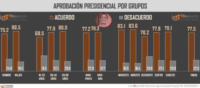 Dicho estudio arrojó que el 77.5% de la población aprueba el trabajo de la Presidenta Sheinbaum rumbo al cierre de 2025, mientras que un 22.5% está en desacuerdo con su desempeño, siendo las mujeres el sector que más esta de acuerdo con el papel de la mandataria con un 80.5% por encima del 75.2% de aprobación por parte de los hombres.
