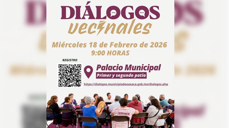 Oaxaca de Juárez, Oax.- El Municipio de Oaxaca de Juárez invita a vecinas y vecinos a participar en la próxima jornada de Diálogos Vecinales, un espacio de atención directa donde la ciudadanía puede presentar propuestas, planteamientos y prioridades para su colonia o agencia.