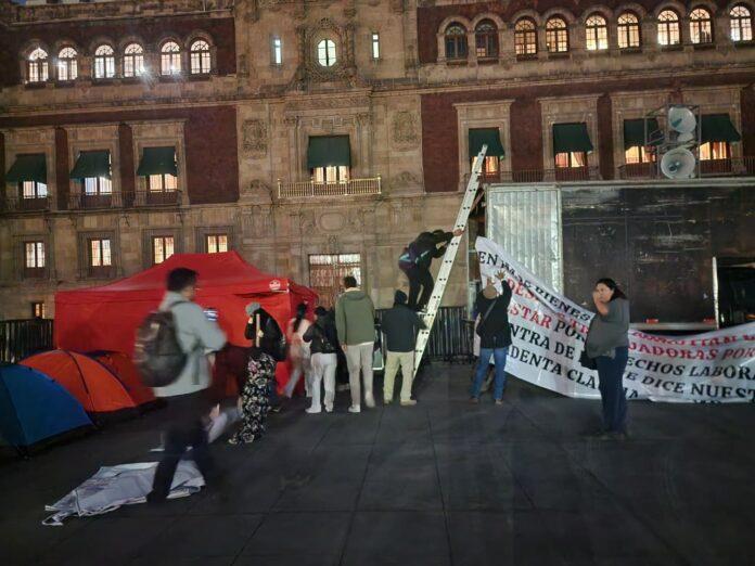 Ciudad de México. Con una gran manta desplegada sobre las vallas que resguardan el frente de Palacio Nacional, trabajadores del IMSS-Bienestar solicitaron la intervención de la presidenta Claudia Sheinbaum para la instalación de mesas de diálogo resolutivas y atender distintas problemáticas en el sector, entre ellas garantizar insumos médicos suficientes y negociar condiciones laborales dignas.
