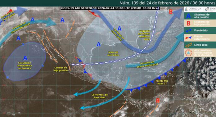 Estas condiciones se deben a la masa de aire frío que impulsa al frente frío número 37, la cual cubre gran parte del oriente, sur y sureste del país, así como la Península de Yucatán.