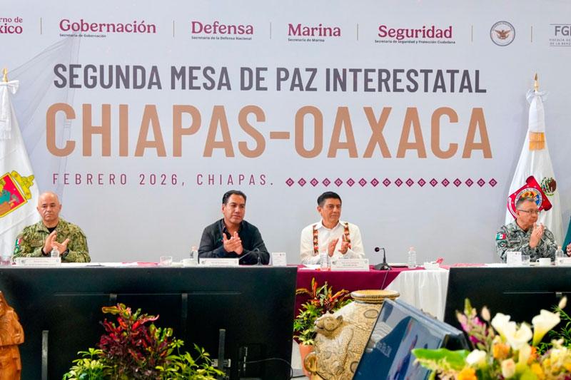 Tuxtla Gutiérrez, Chis. 26 de febrero de 2026.- El Gobernador Salomón Jara Cruz y su homólogo de Chiapas, Eduardo Ramírez Aguilar encabezaron la segunda Mesa de Paz Interestatal para fortalecer la colaboración entre ambas entidades y consolidar acciones conjuntas en favor de la estabilidad en el sur-sureste del país.