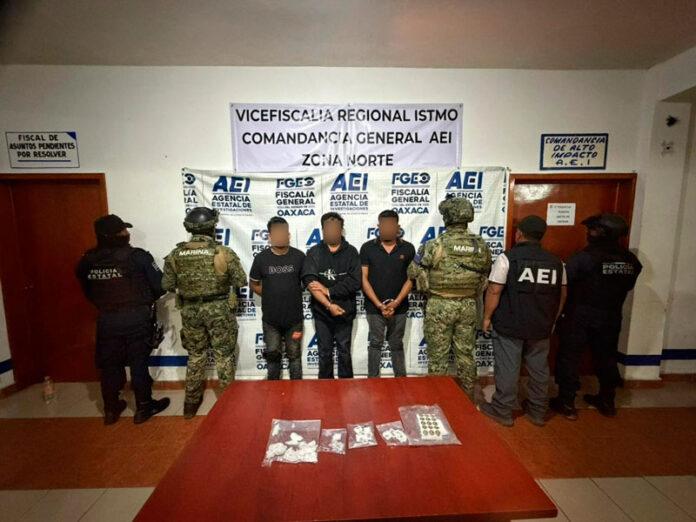 Derivado de recorridos de vigilancia, elementos navales en coordinación con personal de la Fiscalía General del Estado de Oaxaca (FGEO), atendieron un reporte de narcomenudeo en citado municipio en inmediaciones de la colonia Barrio Nuevo, donde se visualizaron dos vehículos sospechosos con personas del sexo masculino en su interior.