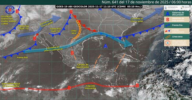El Servicio Meteorológico Nacional (SMN) pronosticó para este lunes 17 de noviembre de 2025 que el frente frío 14 se desplace hacia Estados Unidos y deje de afectar al país.