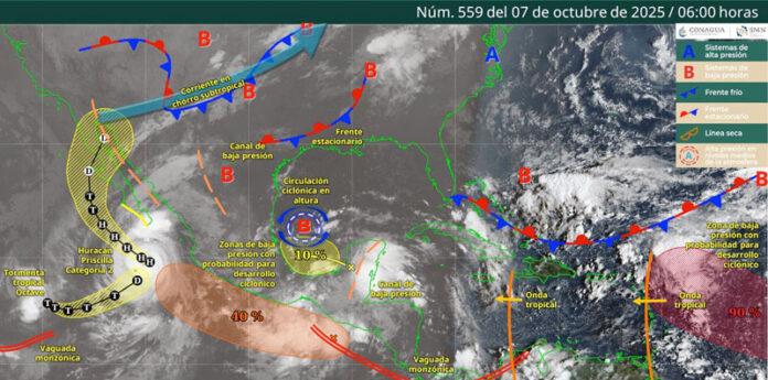 Todo esto es generado por una zona de baja presión con potencial alto para desarrollo ciclónico en inmediaciones del Golfo de Tehuantepec, que se ubica dentro de la vaguada monzónica; en combinación con una segunda baja presión que se internará sobre la Península de Yucatán, que al emerger sobre la sonda de Campeche puede evolucionar a ciclón tropical en los próximos días al sur del Golfo de México.
