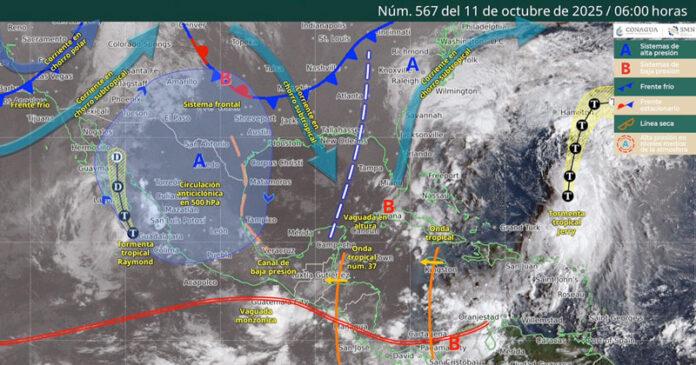 Estas condiciones se derivan de la vaguada monzónica que se observa en el Pacífico sur, que bordea la costa oaxaqueña e interactúa con la onda tropical número 37.
