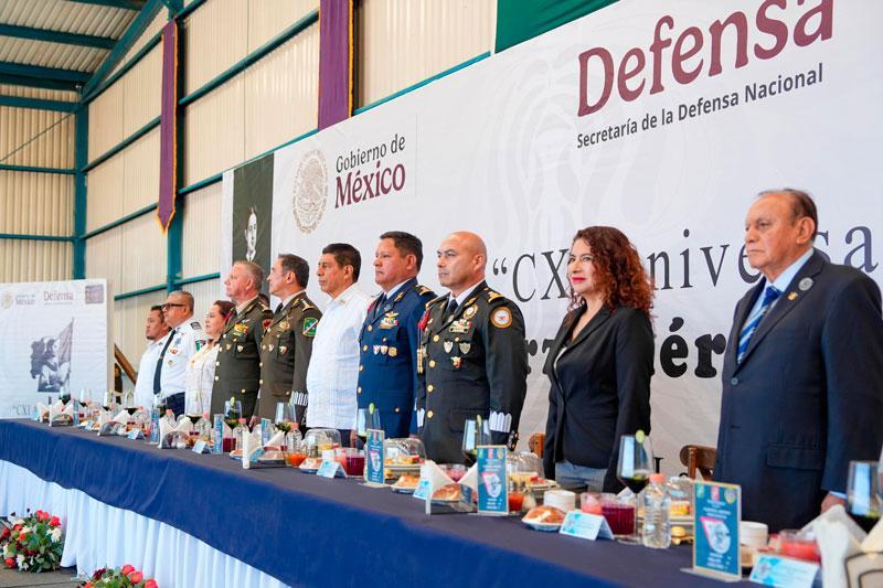 Santa Cruz Xoxocotlán Oax.- El Gobernador Salomón Jara Cruz asistió a la conmemoración del CXI Aniversario de la Fuerza Aérea Mexicana; donde reconoció que esta institución se distingue por su trabajo solidario y humanitario en favor de la población.