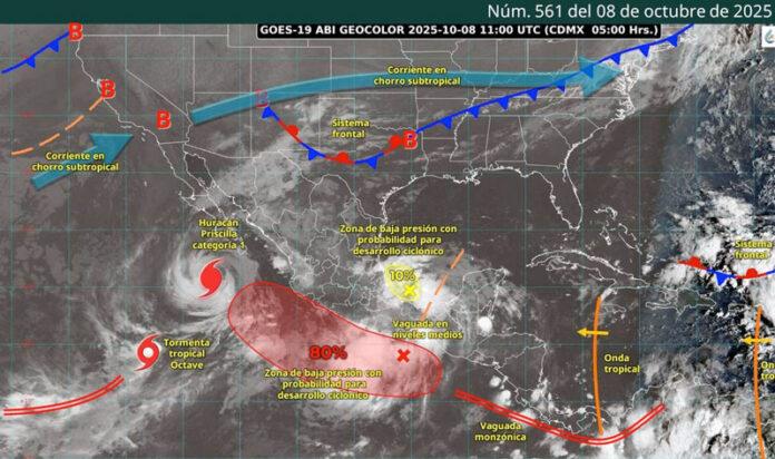 Esto se deriva de la interacción de una zona de baja presión con potencial alto para desarrollo ciclónico frente a las costas de Oaxaca y Chiapas, inmersa en la vaguada monzónica; y de una segunda baja presión sobre la sonda de Campeche, apoyada por una vaguada en niveles medios y altos de la troposfera.