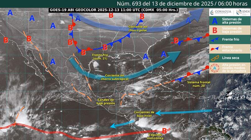 Por otra parte, el frente frío número 21 ingresará al Golfo de México y continuará su desplazamiento hacia el sureste. A partir de este domingo, se pronostican cambios en el patrón atmosférico, con incremento en los vientos del norte, descenso de temperatura y lluvias en el norte del estado.